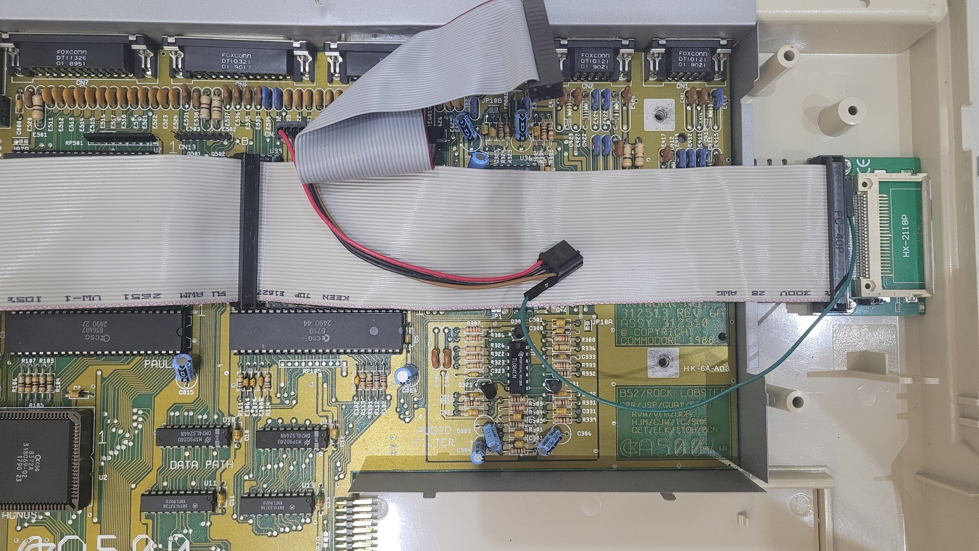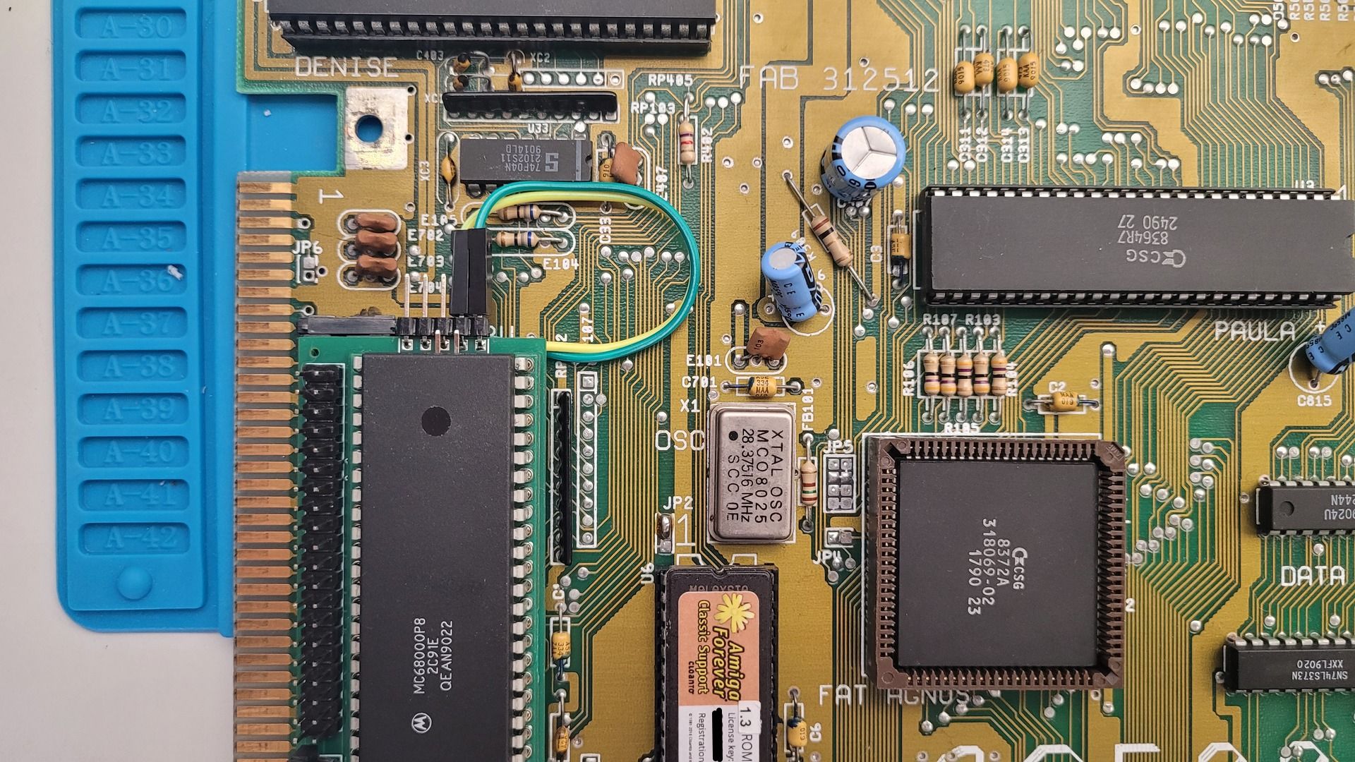 The kit comes with Dupont wires and small clip-style “pliers” to grab these signals respectively from pin 21 of CIA A and pin 29 of Gary.