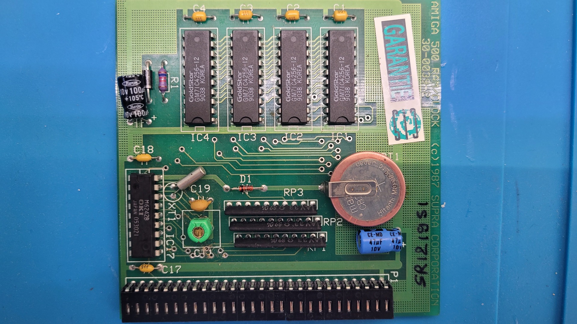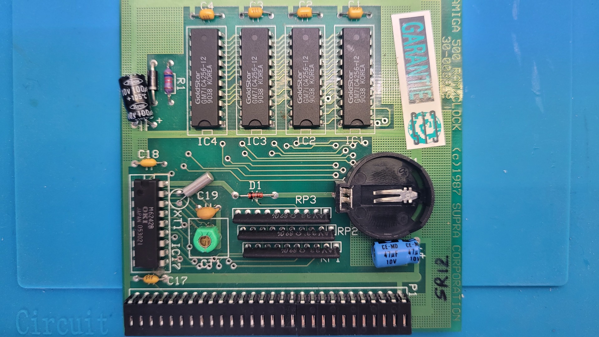 Of course, I found a memory expansion installed: a SupraRam 500 Rev.2 (details here), identifiable by the four DIP switches. It’s a very neat card — the battery uses a standard coin cell, which is much less prone to leaking than typical NiMH batteries.