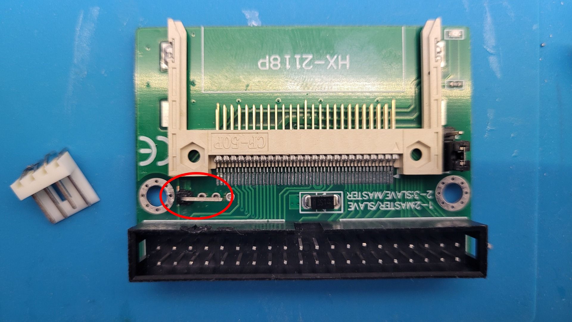 To simplify things, I modified the CF adapter, removing the bottom power connector and adding only the single required +5 V pin on top.