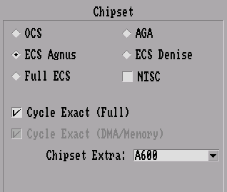 - Chipset: ECS Agnus with A600 selected under “Chipset Extra” — this is important, otherwise the IDE controller will be disabled