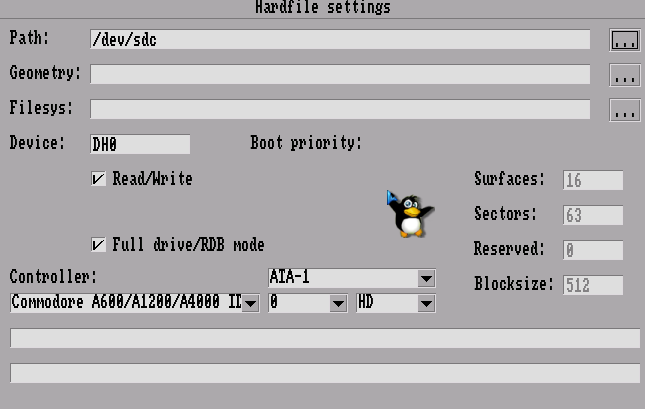 - Hard Drive: Mapped the Linux device corresponding to my USB CF card reader, selected the Commodore A600 controller, and set the mode to ATA-1 — this is essential, or the CF card won’t be detected correctly