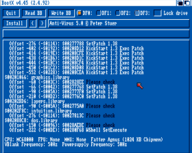 | BootX | Up-to-date antivirus for OS 1.3 | On my setup it crashes often, but it can detect viruses in memory, bootblocks, floppies, and files. Installation: libs/reqtools.library.13 to SYS:libs, all BootX files to SYS:system , BootX.doc to SYS:docs, latest recognition file to SYS:system. Adjusted colors for a Workbench 1.3 look: color1=blue 05A, color2=white FFF, color3=black 002, color4=orange F80. |